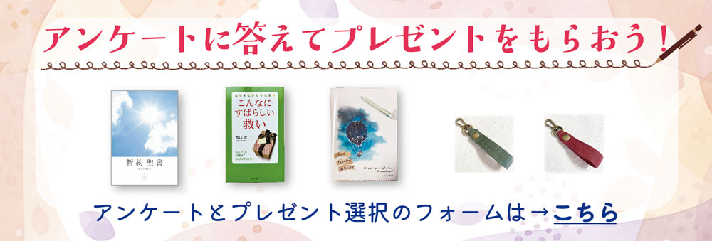 ○ アンケートに答えてプレゼントをもらおう!フォームはこちら。当教会配布のグッドニュースやイベントフライヤーを受け取られた方は、添付されているハガキ(切手不要)からもお申し込みできます!