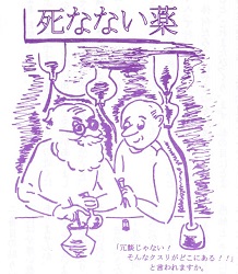 その頃、まだ幼かった私はいつも目にとまる珍しいこの店の看板にひかれて、その店内にひとりで入って行ったことがあります。死なない薬って一体何だろう、はやる心を押えながら中に入ると、これまたびっくり。まず、私の目にとまったのは変わった貼り紙で、「腹のへらないクスリ」とありました。その下に置かれているもの、それは何と一束の稲でした。少し進むと、こんどは二番目の貼り紙です。「賢くなるクスリ」その下には分厚い数冊の書物が置かれてあるではありませんか。
