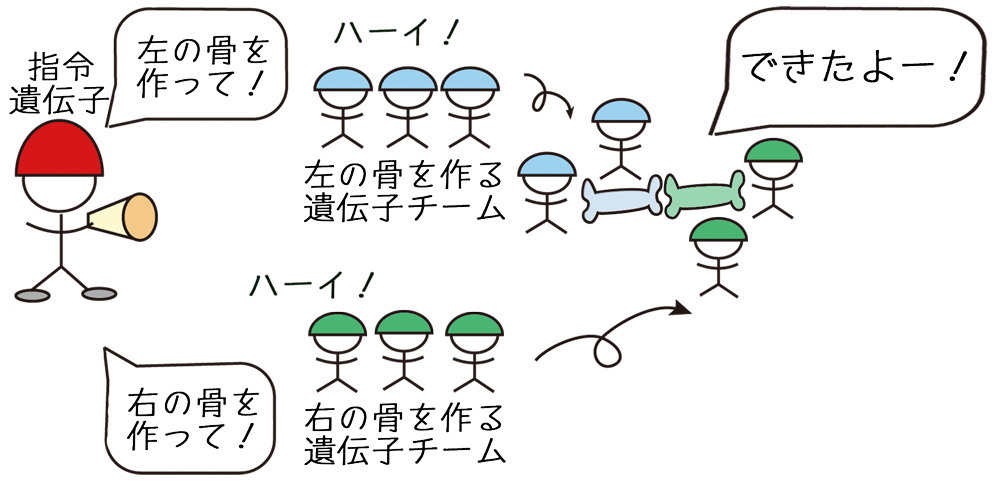指令遺伝子が命令すると、それに従って作る係の遺伝子チームが働いて、体を作り、人間の形になっていくんだ。