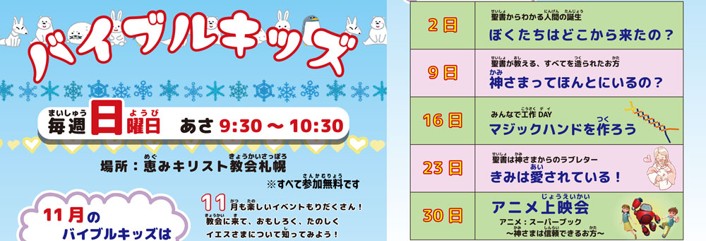 ○ 小学生礼拝・バイブルキッズ☆毎週日曜9:30〜10:30にやってるよ きてね!11月のフライヤーだよ!